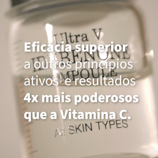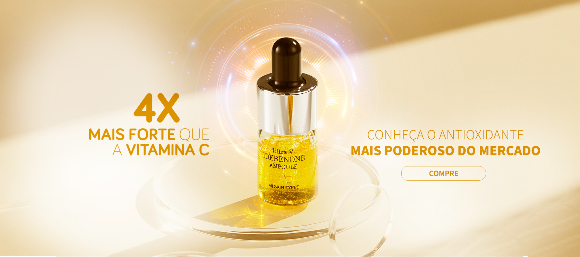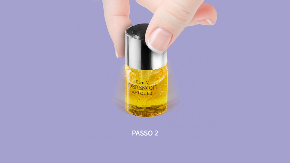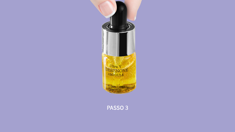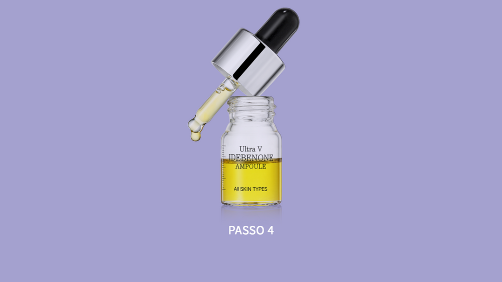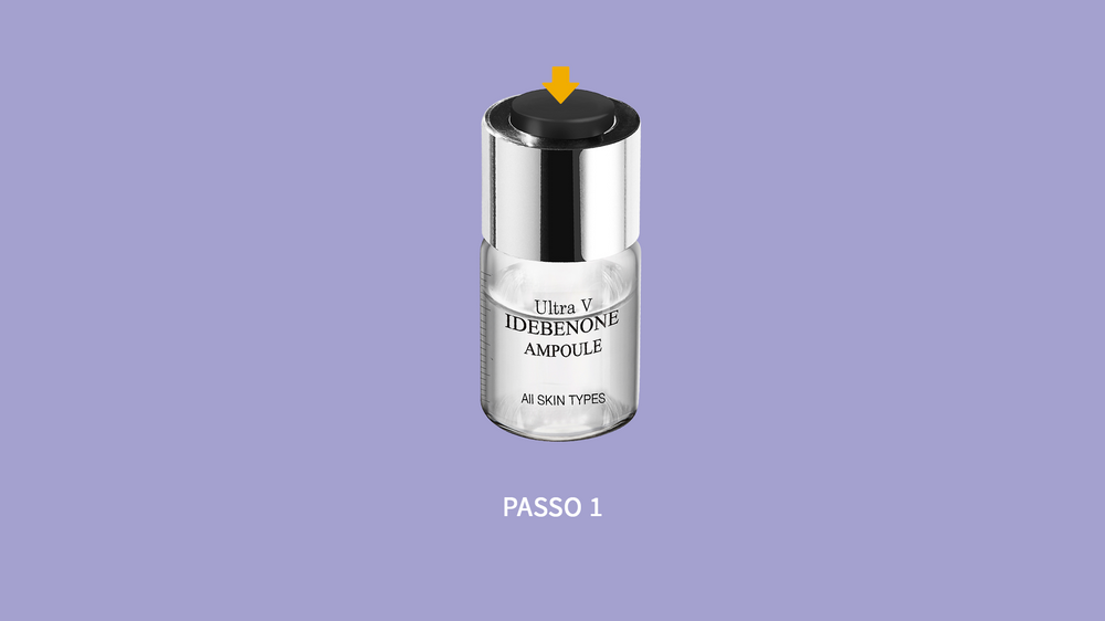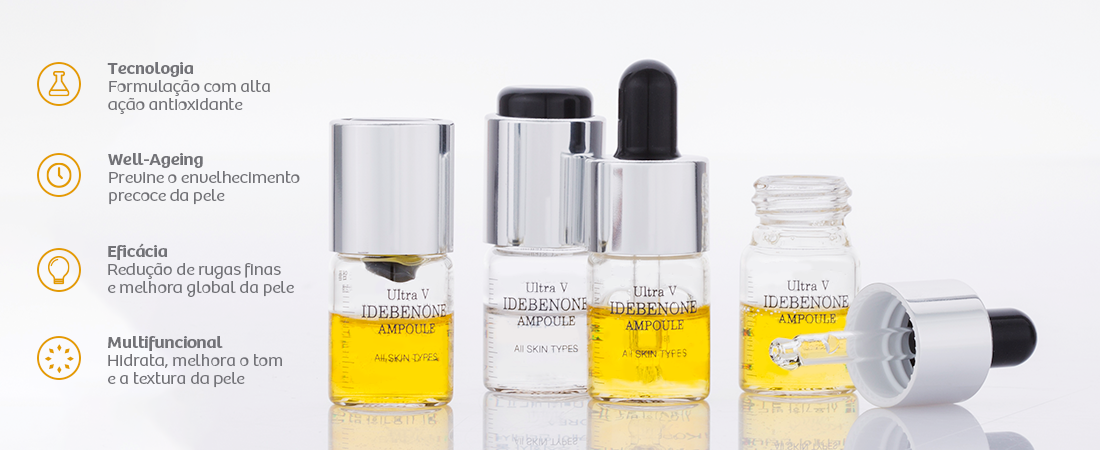 Idebenone Ampoule possui uma apresentação inovadora, são 4 ampolas de 8 ml cada com duas soluções. A primeira mantém o princípio ativo fresco, estável e encapsulado, enquanto a segunda é uma solução líquida, composta de ingredientes antioxidantes e hidratante: Ácido Hialurônico, Niacinamida, Vitamina E, Pantenol, Peptídeos e Extrato de plantas.